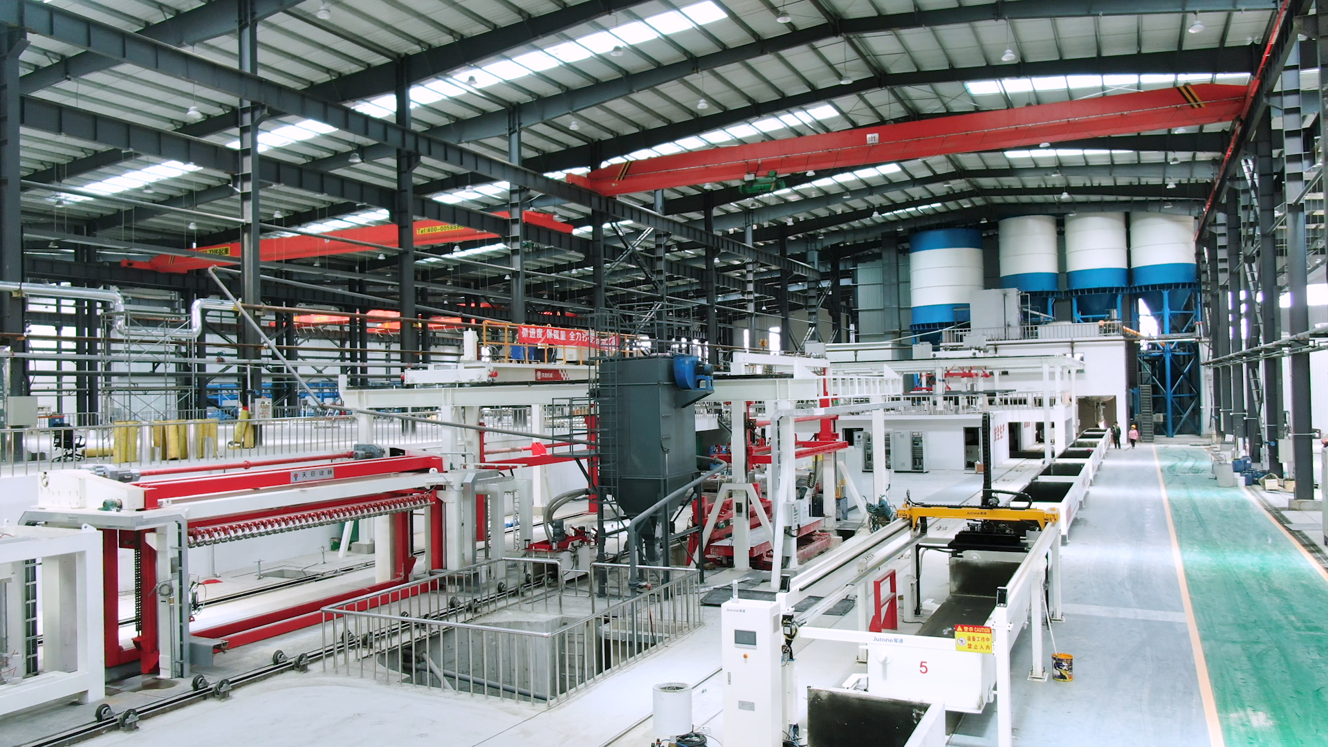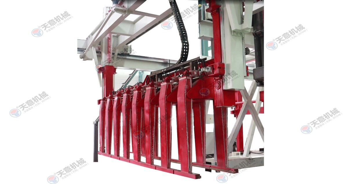 翻轉吊機:抓取模箱翻轉90°,側立在切割小車上進行切割;切割工段空翻脫模機將??蚍D90°,放在切割小車支座上進行脫模,脫模后的??蚺c清理后的側模板進行合模,合膜后的空模框被吊運至模具回程軌道上進行涂油處...