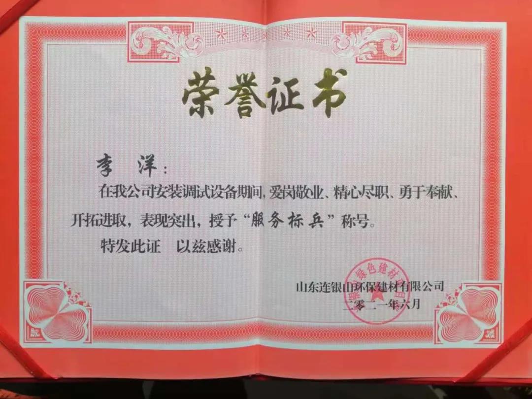 炎炎夏日,天意機(jī)械在向客戶山東連銀山環(huán)保建材有限公司售出保溫裝飾一體化板生產(chǎn)線之后,隨即派出售后團(tuán)隊(duì)對(duì)設(shè)備進(jìn)行安裝調(diào)試及售后培訓(xùn)。售后團(tuán)隊(duì)不畏酷暑,精心、耐心、專業(yè)地為客戶進(jìn)行安裝調(diào)試,贏得了客戶的好評(píng)和認(rèn)可,客戶為表達(dá)謝意,特授予天意機(jī)械售后人員榮譽(yù)證書和錦旗,以表彰售后人員愛崗敬業(yè)、精心盡職、勇于奉獻(xiàn)、開拓進(jìn)取的精神。