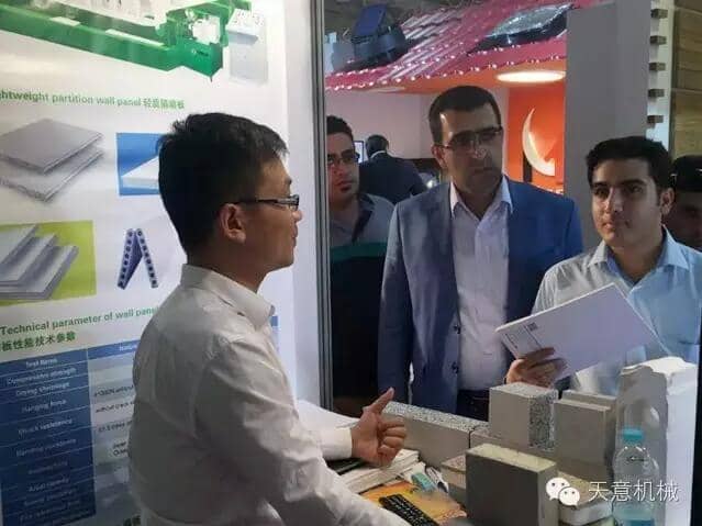 展會上,天意機械銷售經理劉春剛細心的向前來咨詢的客戶,介紹了天意綠色建筑建材裝備在建筑行業(yè)內的應用優(yōu)勢,通過觀看產品應用視頻以及展現(xiàn)成品樣塊,使得天意展位前門庭若市。期間,外貿部銷售經理劉春剛,專程拜訪了天意公司在伊朗年產50萬平方的輕質墻板生產線合作伙伴。詳細了解客戶的生產情況,幫助客戶免費升級技術配方降低成本。